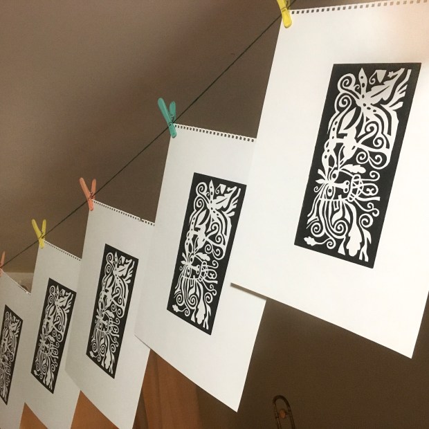 I decided to return to the original drawing I made of a Green Man and use it for a Lino print. Having printed it onto paper, I again tried it on a t-shirt where I think it looks good. The ones seen here are red on white for a child-size shirt and black on khaki for an adult sized shirt.