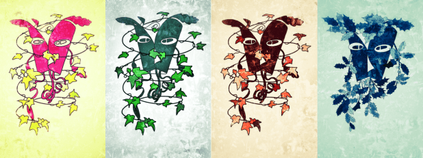 Using the SketchBook app on my iPad, I reimagined the modern Green Man design, using colours and (in the case of Winter) more appropriate foliage to create a series based on the theme of the Seasons. From left to right, they are: Spring, Summer, Autumn and Winter. I also used the Snapseed app to add texture and vignette.