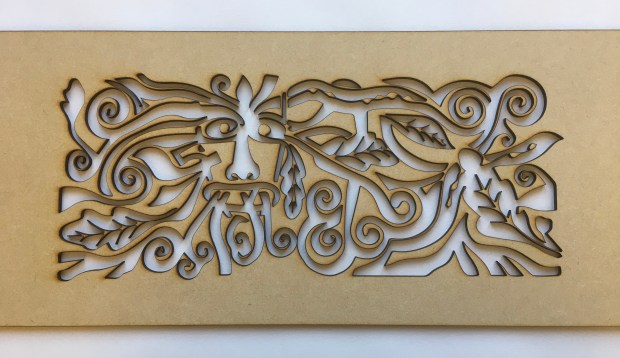 Using a laser cutter, I cut out the re-vamped Green Man design from MDF with a view to creating a light box. The box is filled with ‘Fairy Lights’ that reflect from the crinkled foil background, casting a faint but noticeable pattern on the surface the box stands on. It was always intended as a child’s night light.