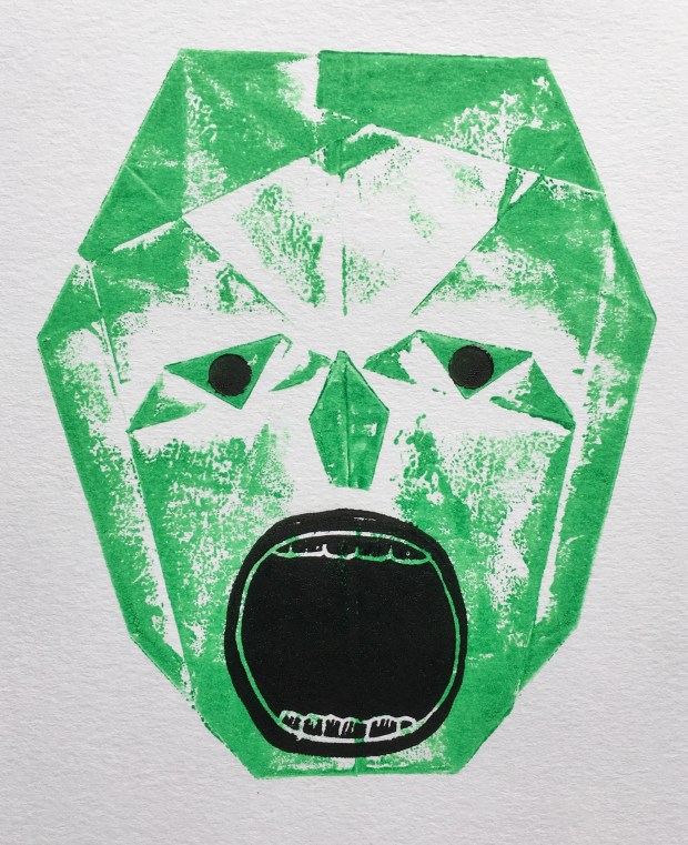 In an idle moment (tea break) during the cutting of the grotesques design, I was toying with the idea of representing various gargoyles and church figures using Origami. Having made the form for a basic face, I decided to see how it would print if I just ran a roller over it before pressing it onto paper. I was really quite taken with the resulting image but it needed a mouth! This was added afterwards using a piece of lino with teeth and lips carved into it. When I get another idle moment, I’m sure I will pursue this idea further! Watch this space…