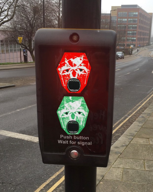 Using the Sketch Book App, I superimposed my Origami Green man print onto a photograph of a crossing control. The second photograph takes the idea a step further…