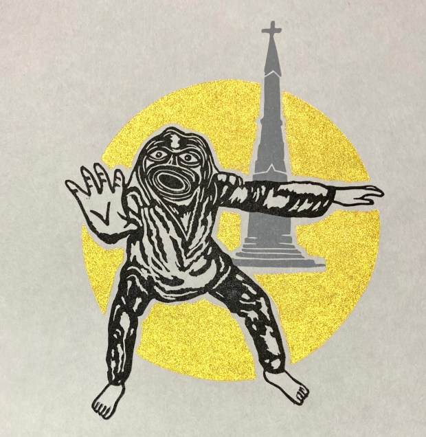 Taking the face from an adaptation of a gargoyle, I created my own version of what Spring Heeled Jack might have looked like – the silhouette in the background being the aforementioned Cholera Monument.