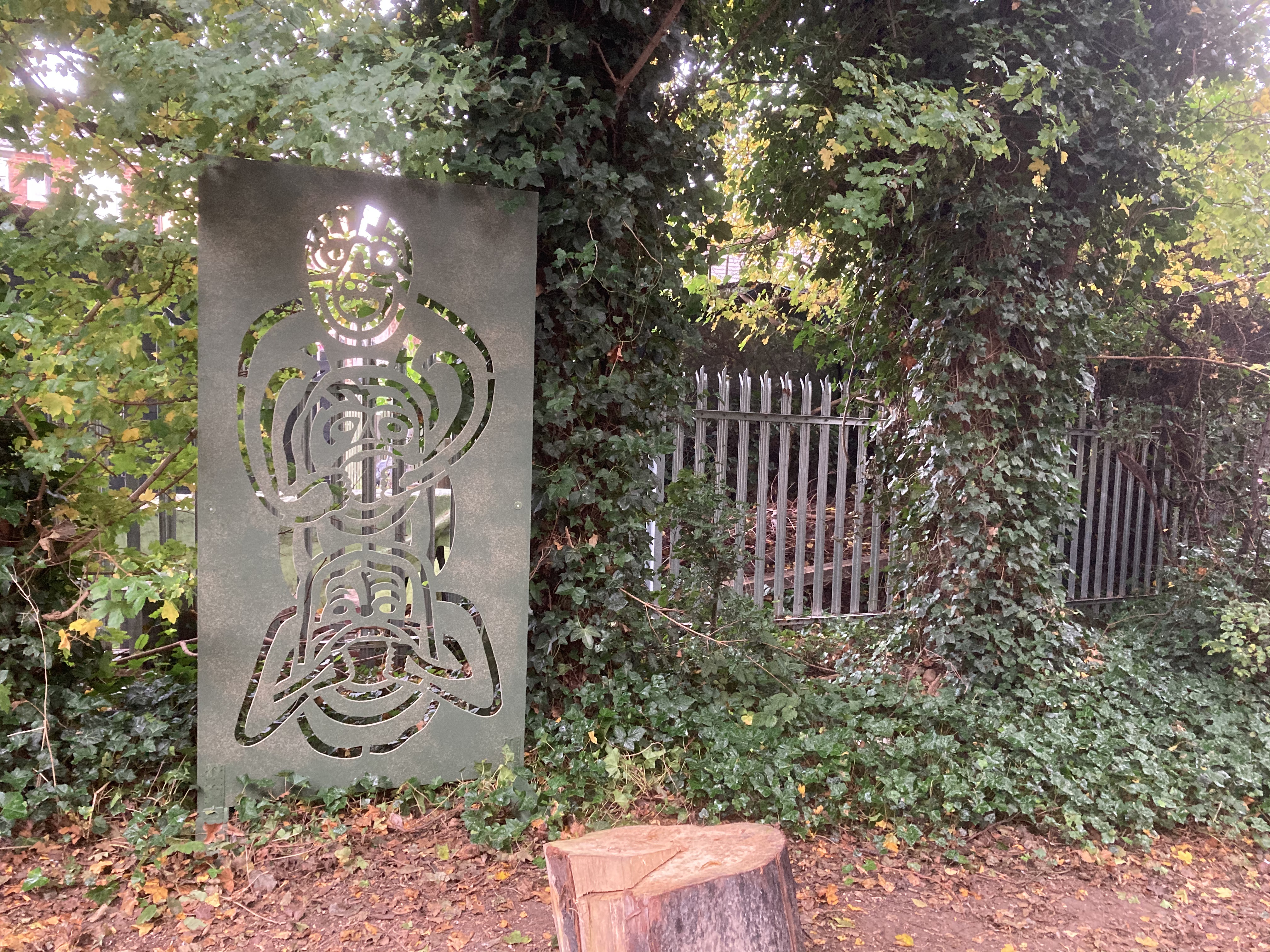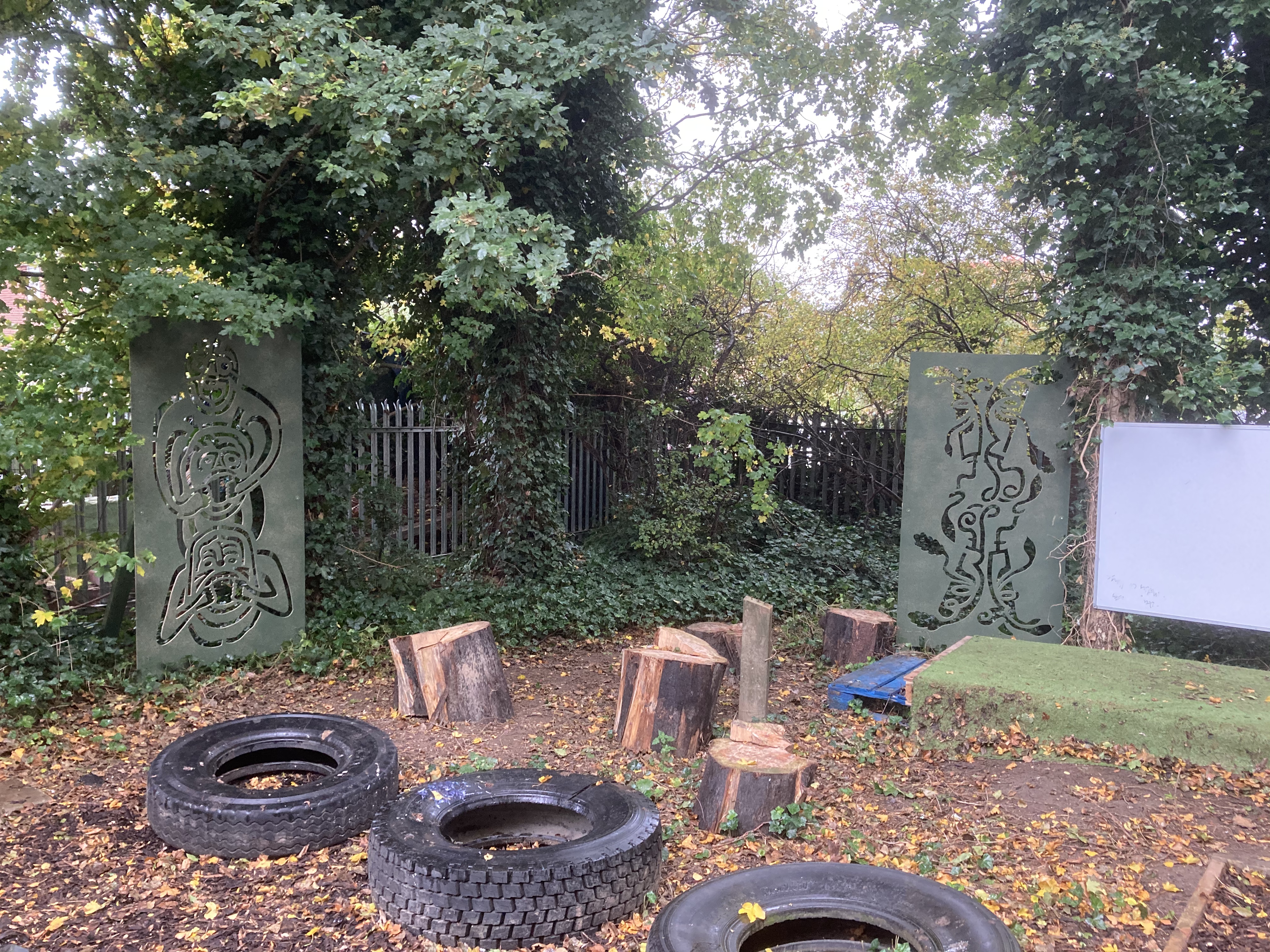Having come to the end of their time in the chapel at Wentworth Woodhouse, I was delighted to be asked if I would consider placing them in the ‘Forest Classroom’ at St Thomas’ Primary School in Rotherham. Of course I agreed, and spent a wet morning positioning them appropriately. It was quickly apparent that this was where they truly belonged; nestled amongst the trees and bushes, enhanced by, and enhancing the natural setting. I realise that, being made from MDF, the panels probably won’t last very long before rotting, but that too seems an appropriate end to their life.