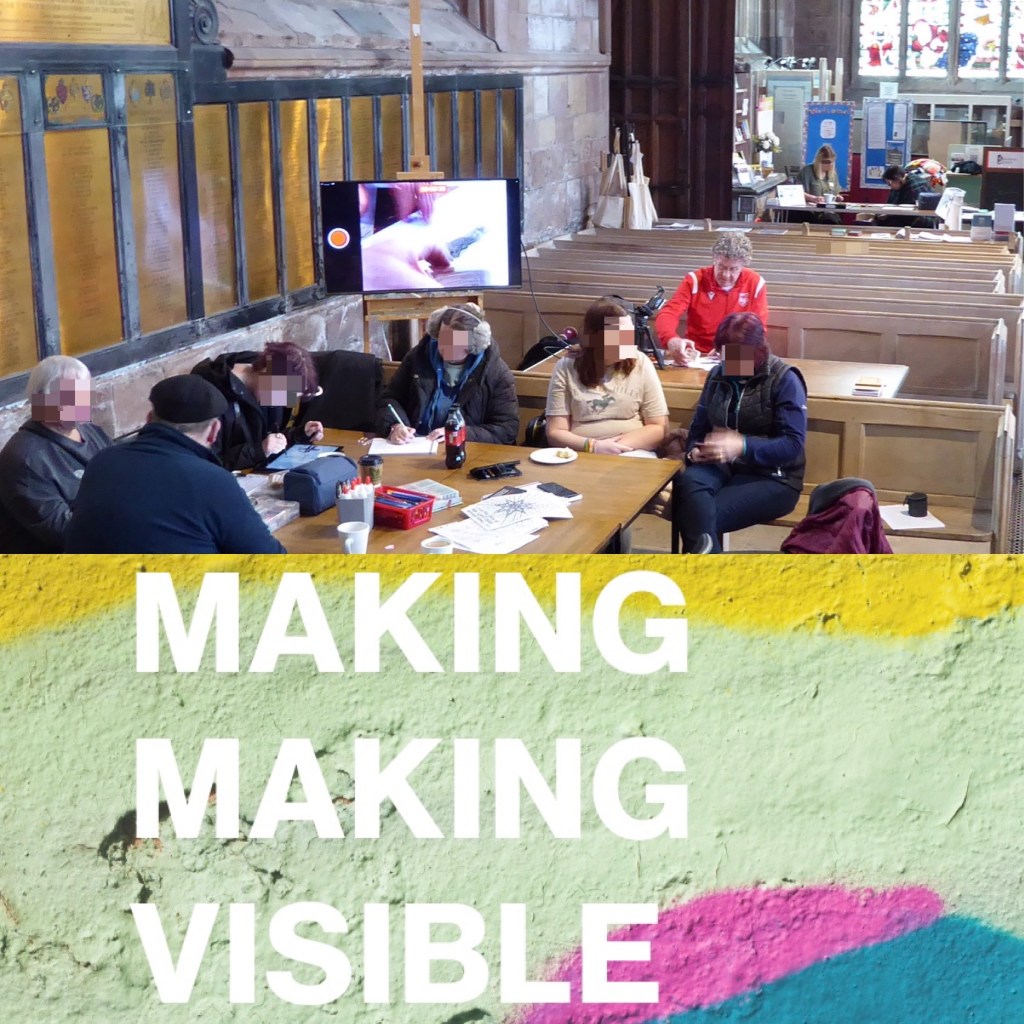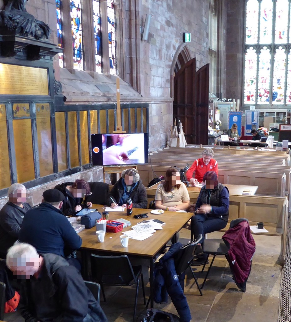 Having been given the opportunity by ROAR (Rotherham Open Arts Renaissance) for the past two months, I have been working at Rotherham Minster in the town centre as an ‘Artist in Residence’. This has been a fantastic chance for ‘Making Making Visible’ and showing people what an artist gets up to in their day to day work. Over the period, sadly now finished, I worked on one large Lino print of the Minster as well as having one day a week where I would take a small detail of the interior of the Minster, and draw, carve and print an image in one session. This was so that the visitors to the church would see how the basic printing process can work. Whilst carving or printing, I showed a live stream of my working on a big screen so that visitors could see in detail what I was doing. Often, they would come and sit by me and chat about what I was doing, or just pass a comment (always positive – thankfully!) or sometimes just come for a chat about themselves and their lives, growing up, what they are up to now or often, what they did before retiring.
