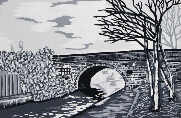 Here is the completed print of Cadman Bridge, a bridge built in 1819 over the Sheffield and Tinsley Canal in Sheffield City centre, England. The bridge is on one of the streets or lanes in Sheffield bearing that name – my name. Research shows that my ancestors, the Cadmans, were mostly scissor or knife makers ie. some of the so-called ‘Little Mesters’ who populated the City many years ago, working in Sheffield steel. A couple of years ago, my band played at a wedding in the Millennium Galleries building in the City centre – it was only recently that I discovered the room we were playing in is called The Cadman Room!